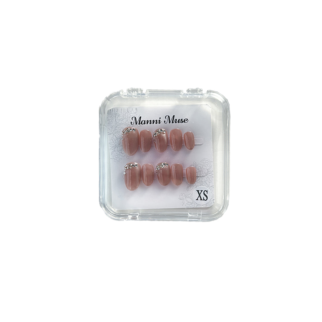 These custom nails feature a rose gold hue with sparkling rhinestone accents, adding a touch of elegance and sophistication to your fashion ensemble.